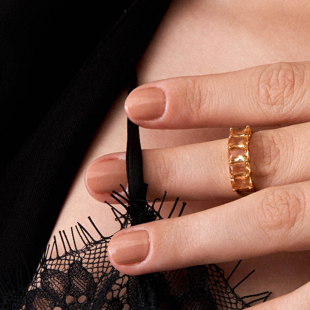 Elegante e luminosa, esta meia aliança em semijoia com banho de ouro 18K é realçada por uma sequência de pedras citrino que refletem tons quentes e sofisticados. Seu design marcante valoriza a mão com presença e feminilidade, tornando-se perfeita para composições refinadas ou para brilhar sozinha com personalidade.