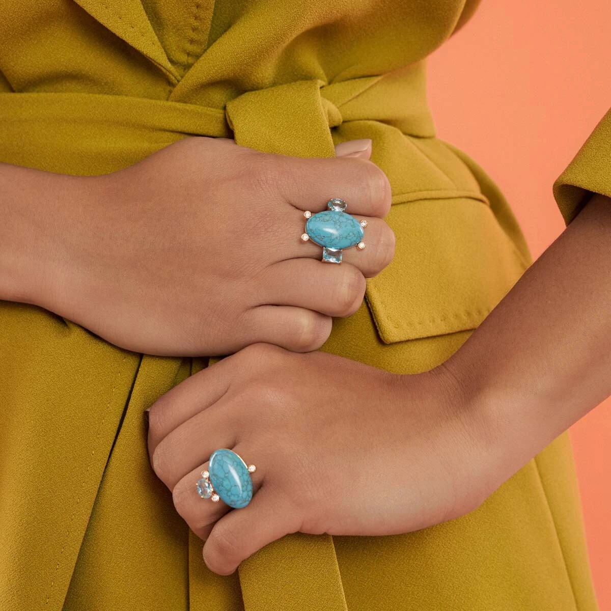 Anel Turquesa Oval com 1 Cristal Azul e 3 Zircônias em Dourado