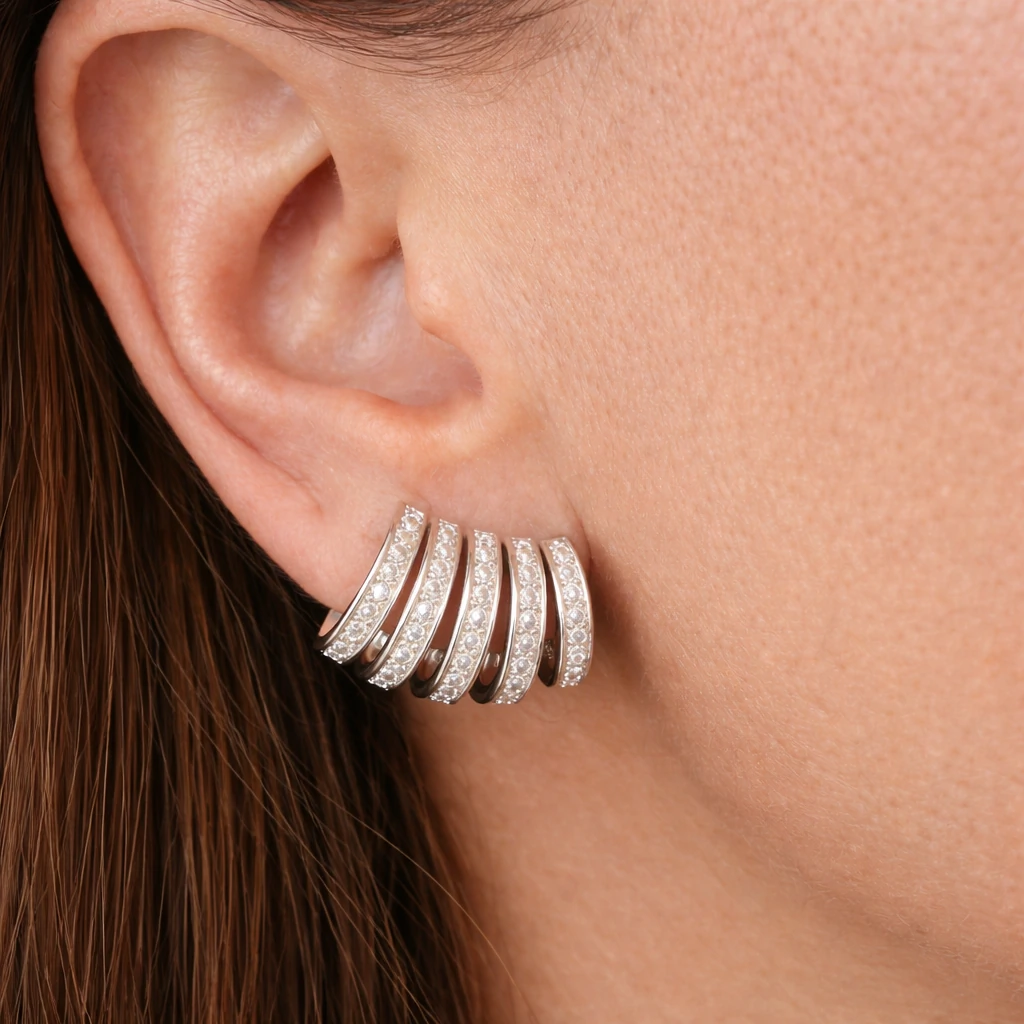 Seu design “agarradinho” envolve a orelha com delicadeza, criando um efeito marcante e atual. Totalmente cravejado com zircônias, ele reflete a luz com intensidade, garantindo um brilho refinado e luxuoso.