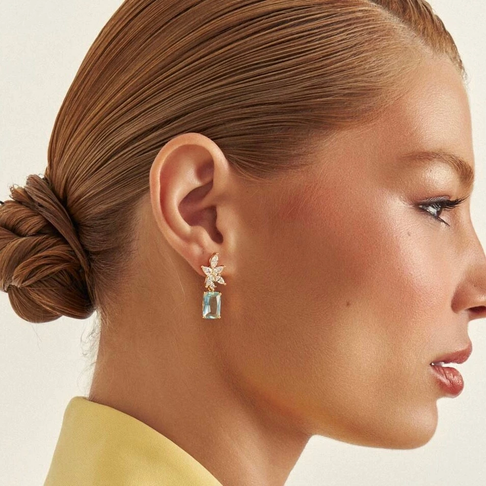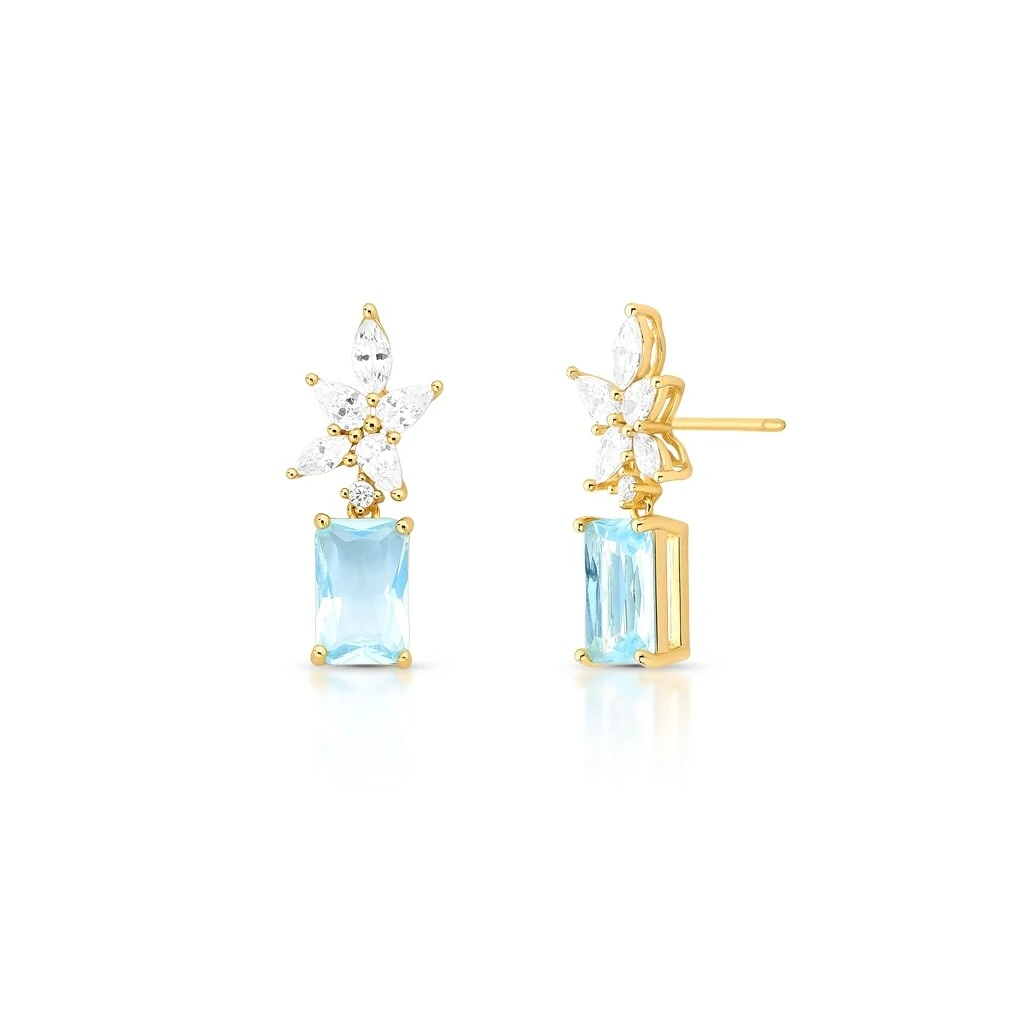 Brinco Água Marinha Fusion Retangular e Flor de Zircônias em Dourado