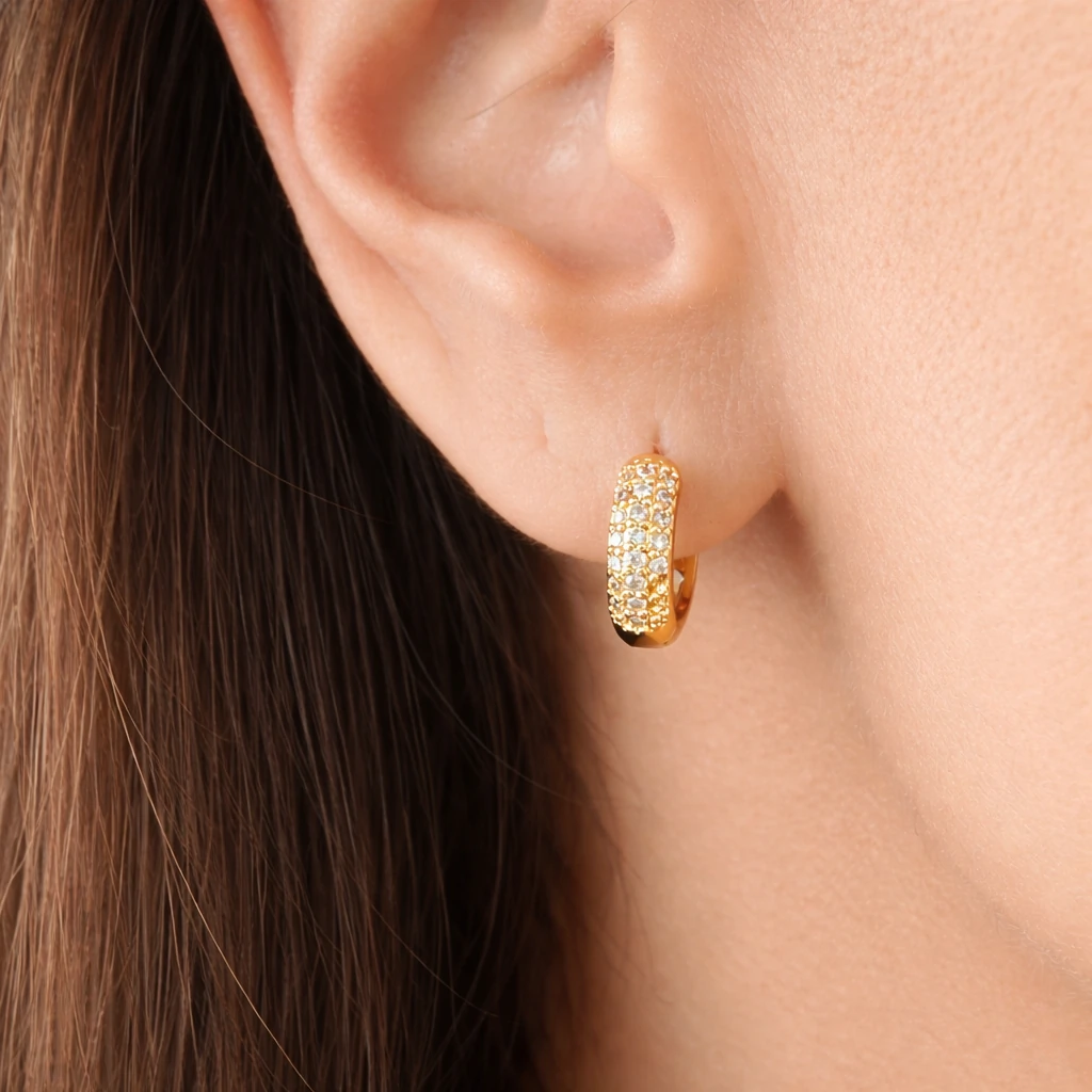 Seu design levemente arredondado valoriza o encaixe na orelha, enquanto as zircônias cravejadas proporcionam um brilho intenso e refinado, elevando qualquer produção com delicadeza e estilo.