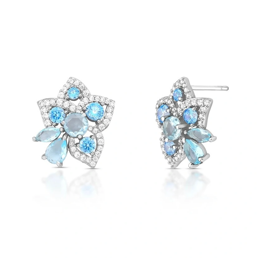 Brinco Flor Água Marinha Fusion e Safira Fusion com Zircônias Cravejadas em Ródio