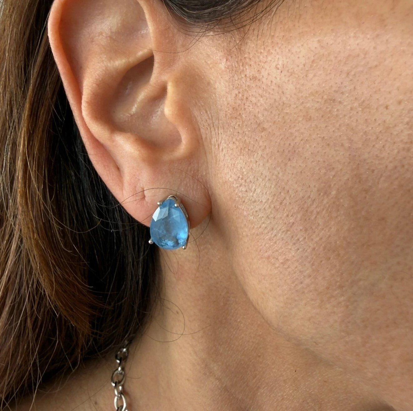 Brinco Turquesa Oval Longo com Cristais Azuis em Dourado