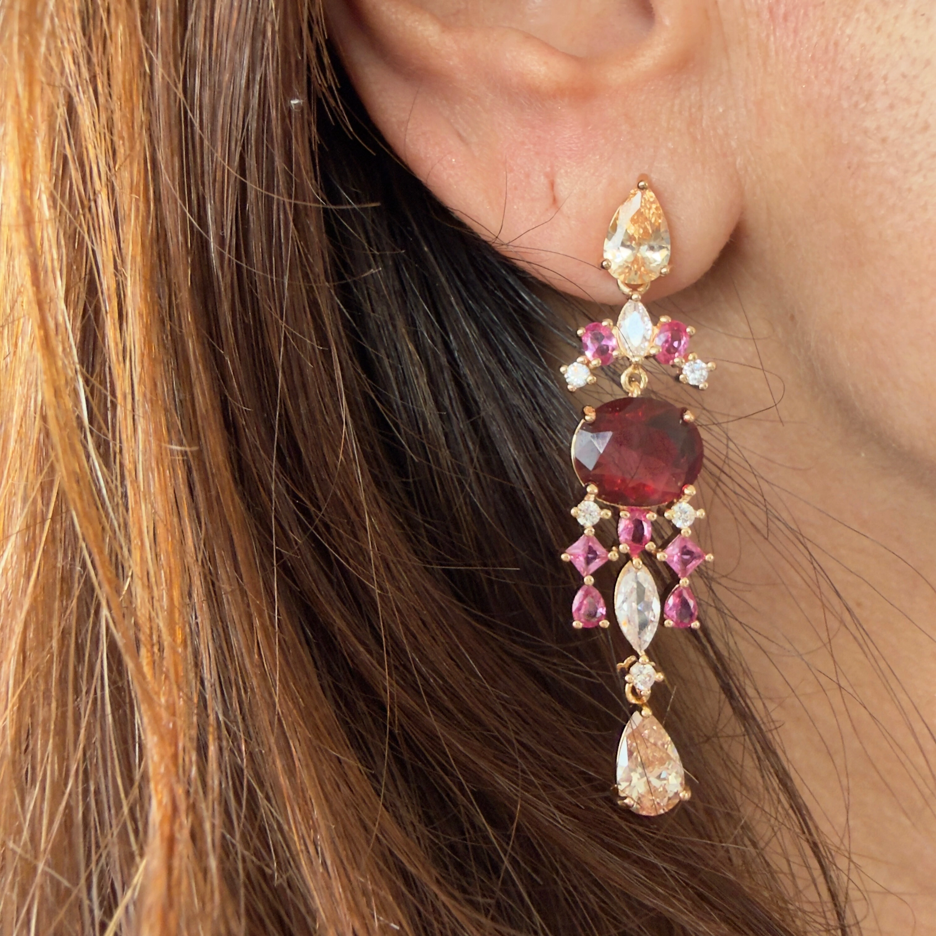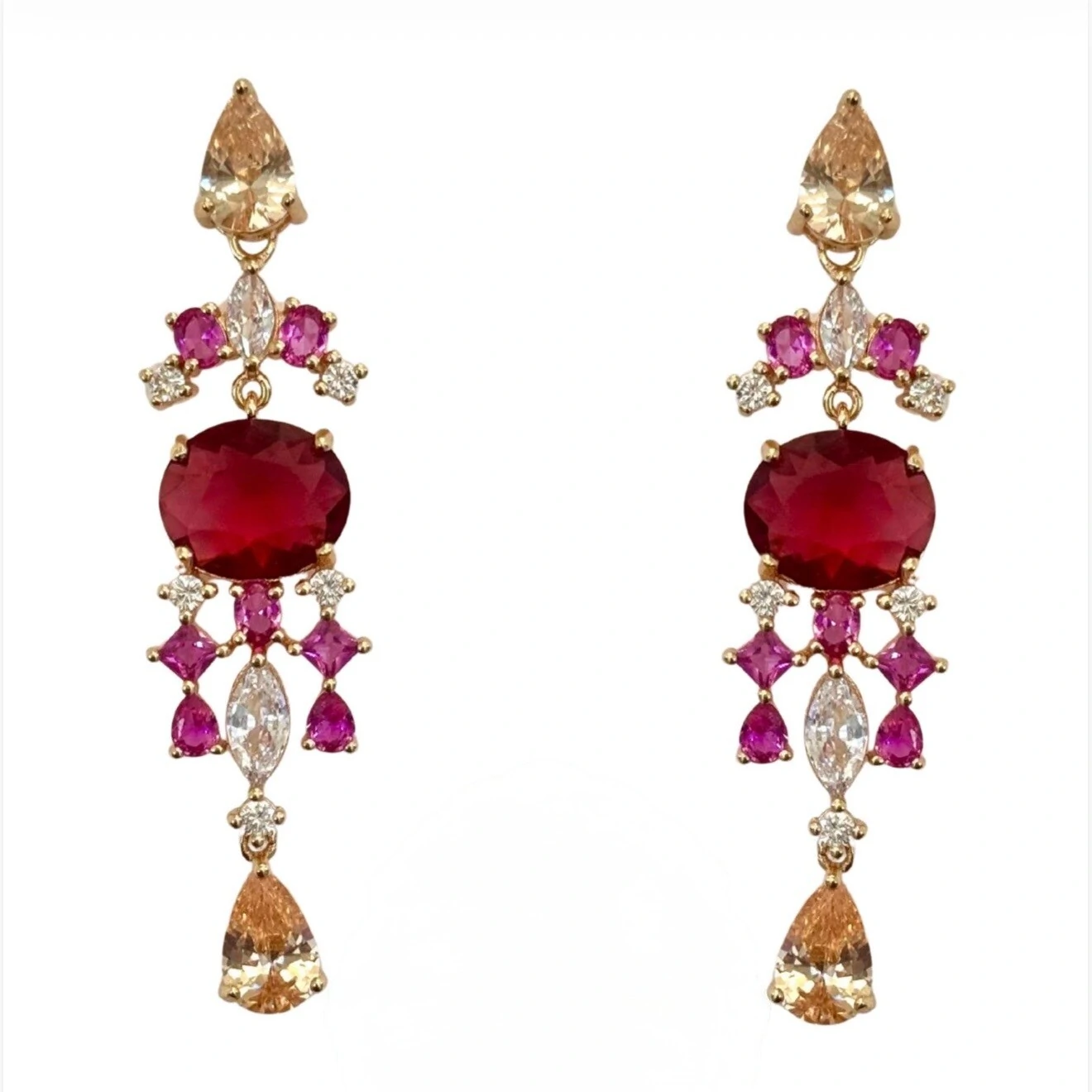 Brinco Longo Rubi Fusion e Quartzos em Dourado