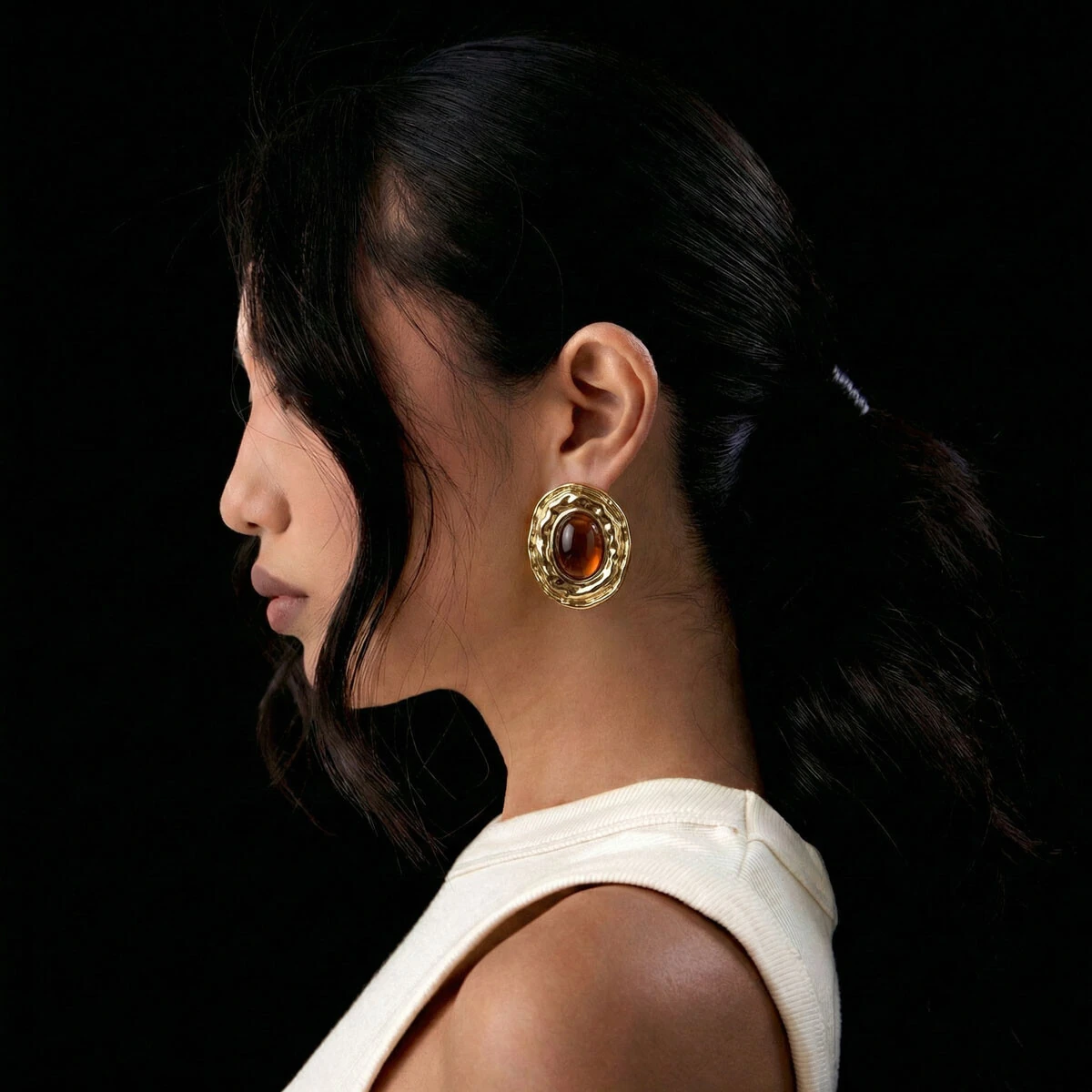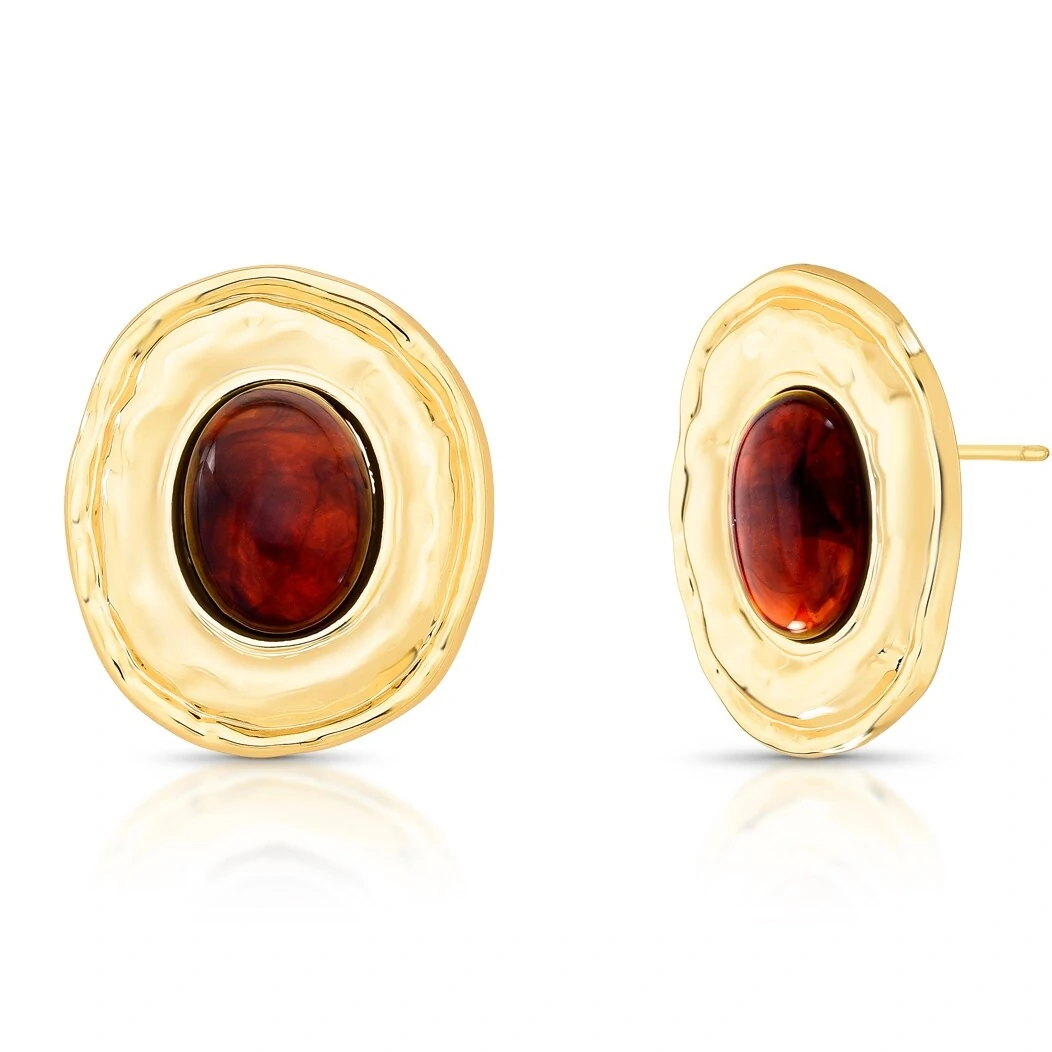 Elegante e marcante, este brinco destaca a beleza intensa da pedra em resina em tom profundo, envolvida por um design orgânico com banho de ouro 18 quilates que valoriza ainda mais seu brilho e sofisticação.