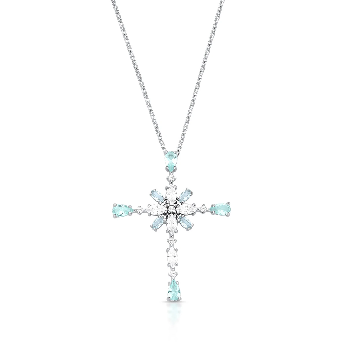 Colar com Cruz Grande com Água Marinha Fusion e Zircônias em Prata 925