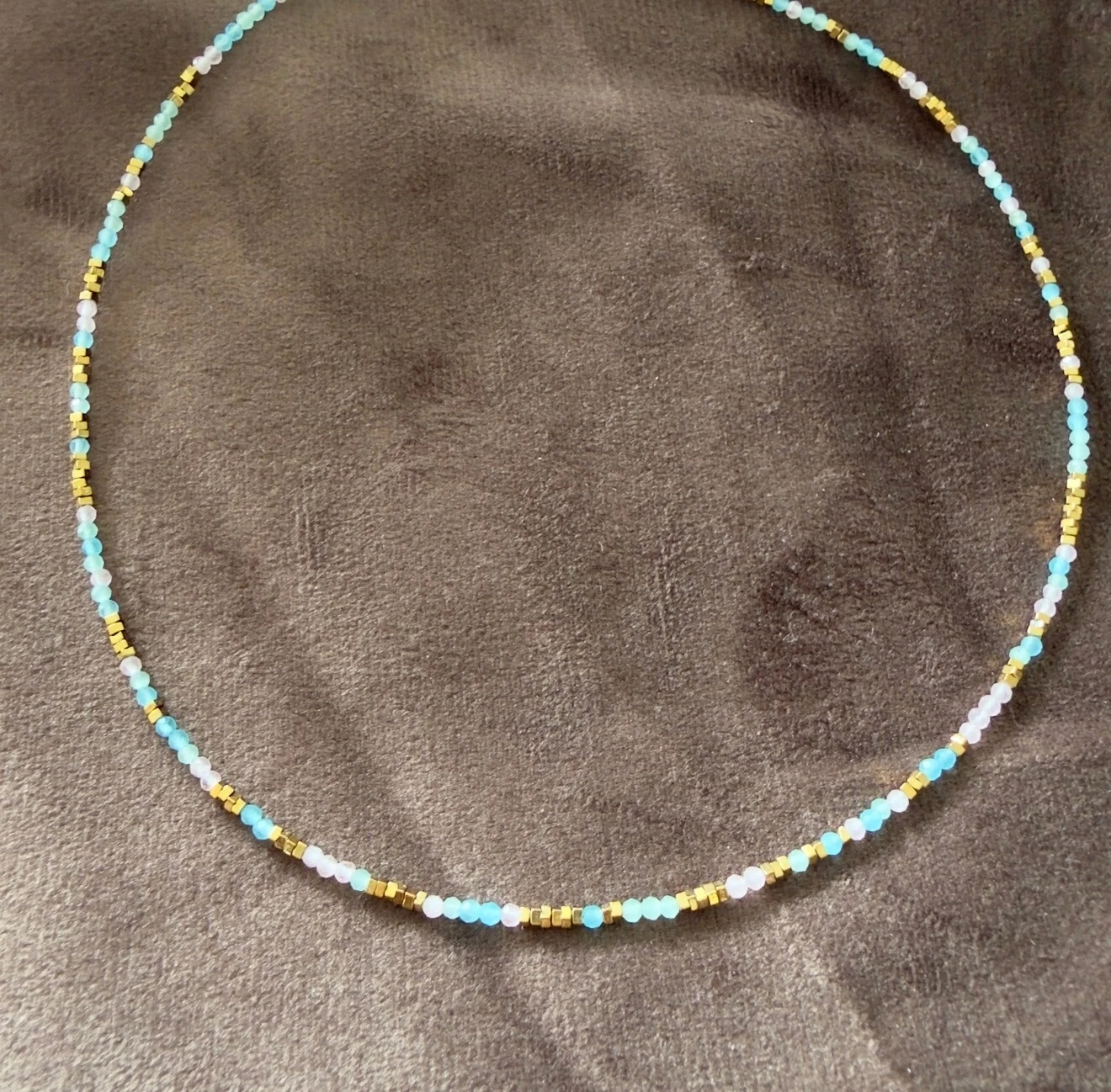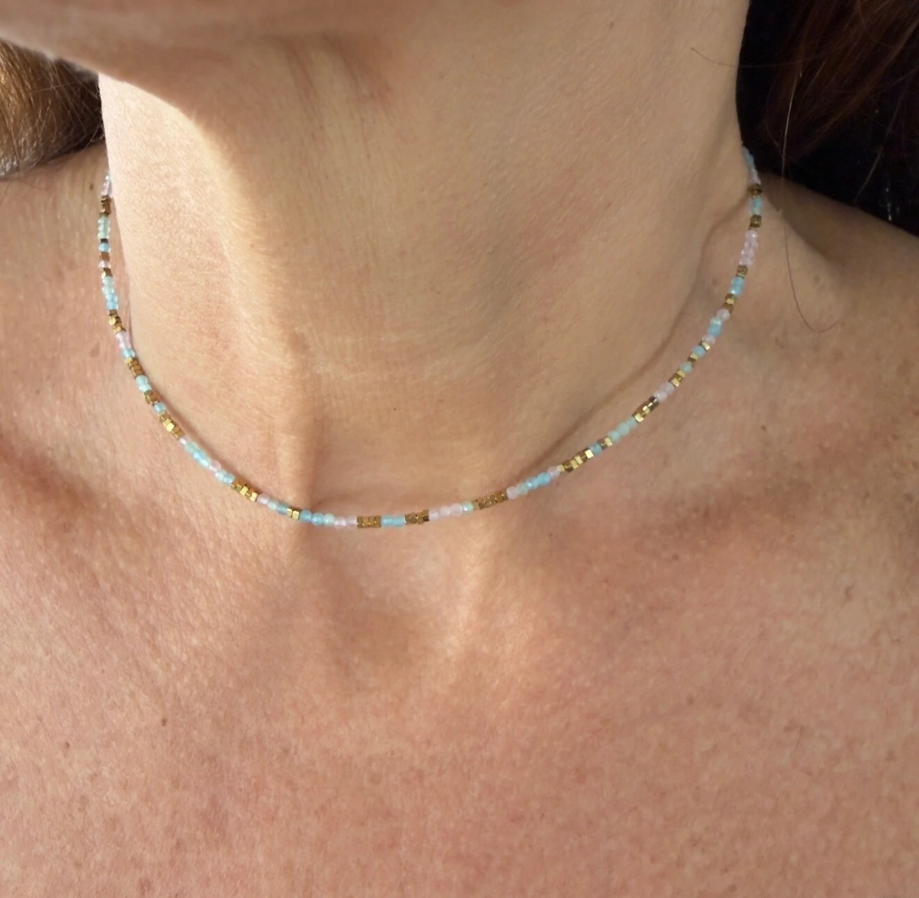 Colar Rodicrosita e Amazonita Entremeios Dourados