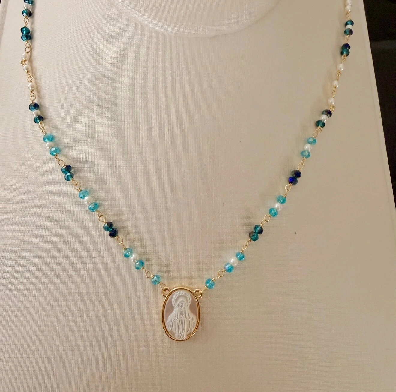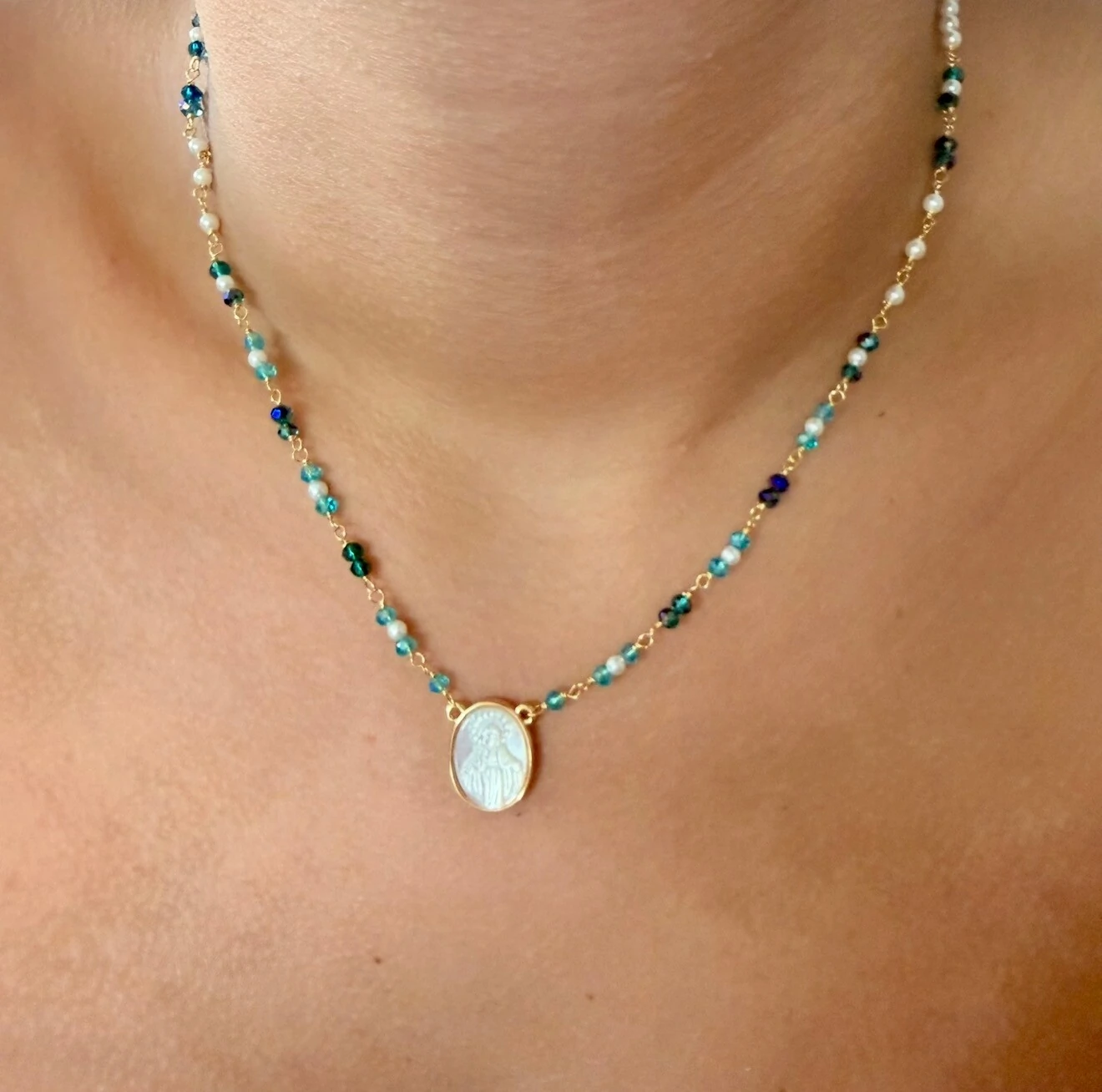 Colar com Pedras Naturais e Pingente Jesus em Madrepérola em Dourado