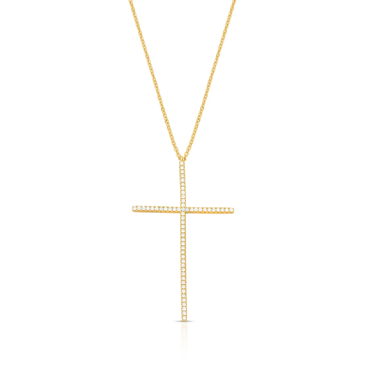 Com pingente de aproximadamente 5 cm, a cruz se destaca pelo seu formato alongado e delicadamente cravejado com zircônias, proporcionando um brilho intenso e refinado que valoriza o colo com elegância.