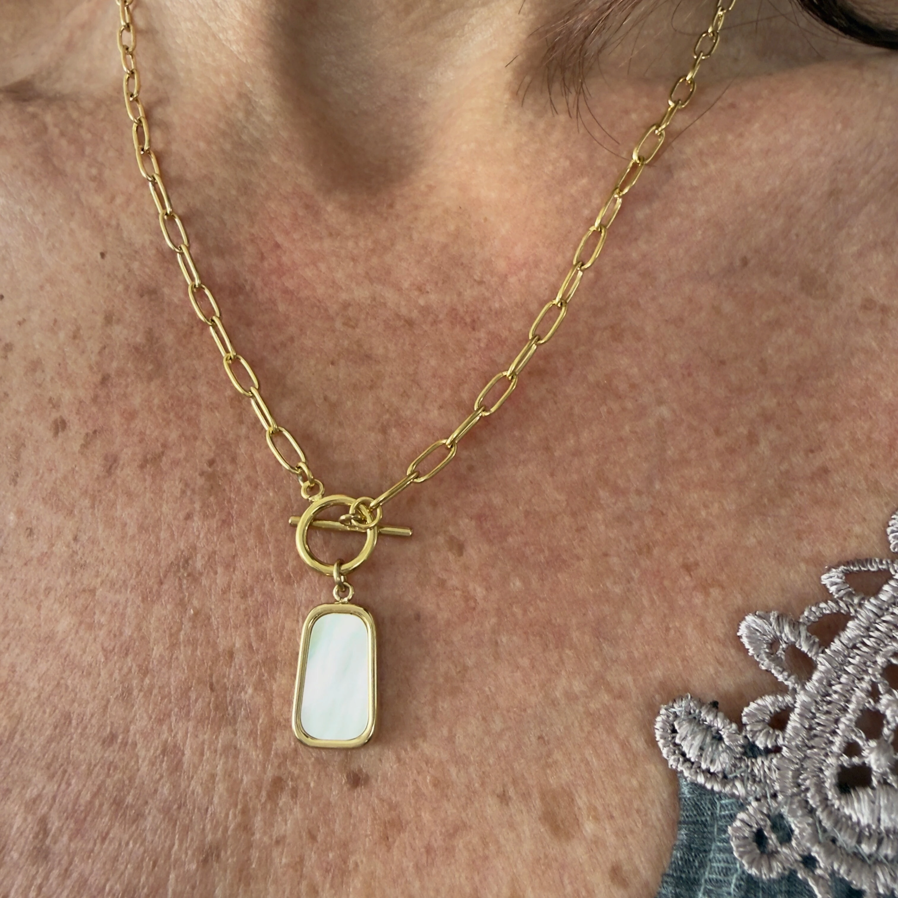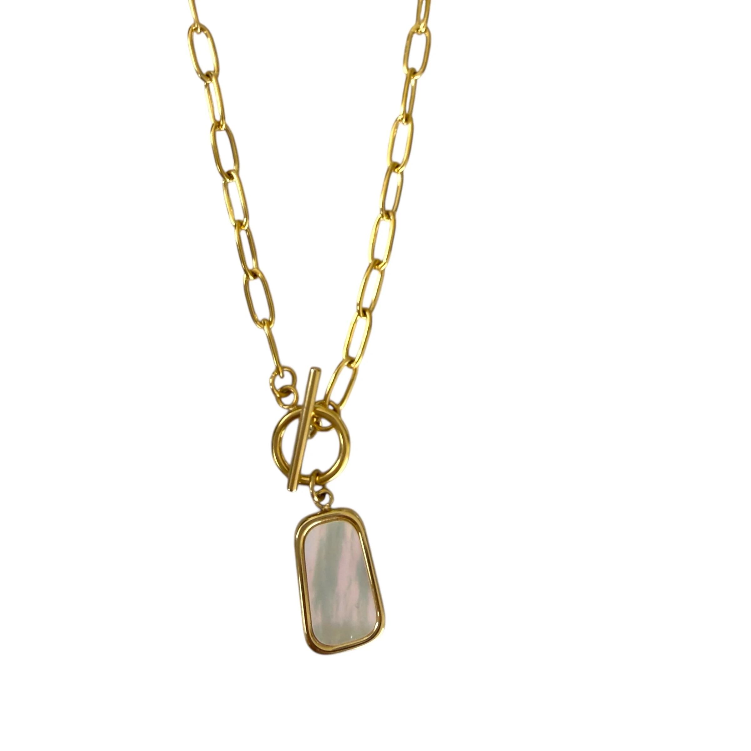 Colar Elos Delicados Fecho Pino c Pingente em Madrepérola Aço