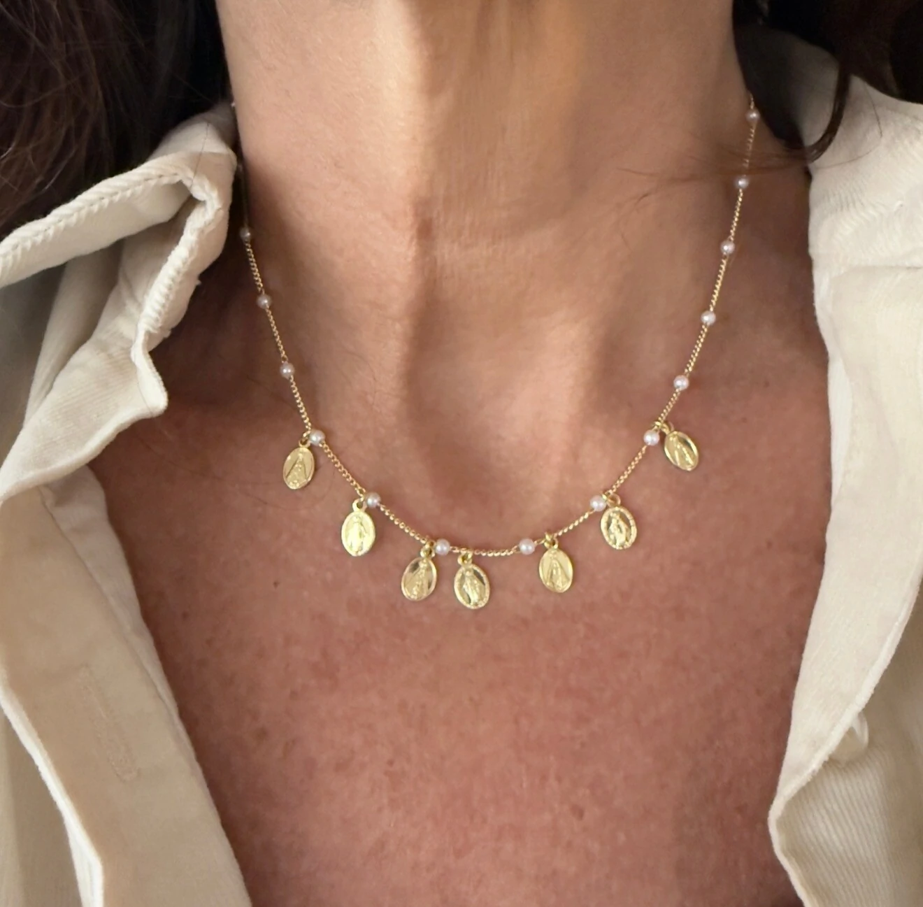 Colar Medalhinhas Nossa Senhora e Perolinhas em Dourado
