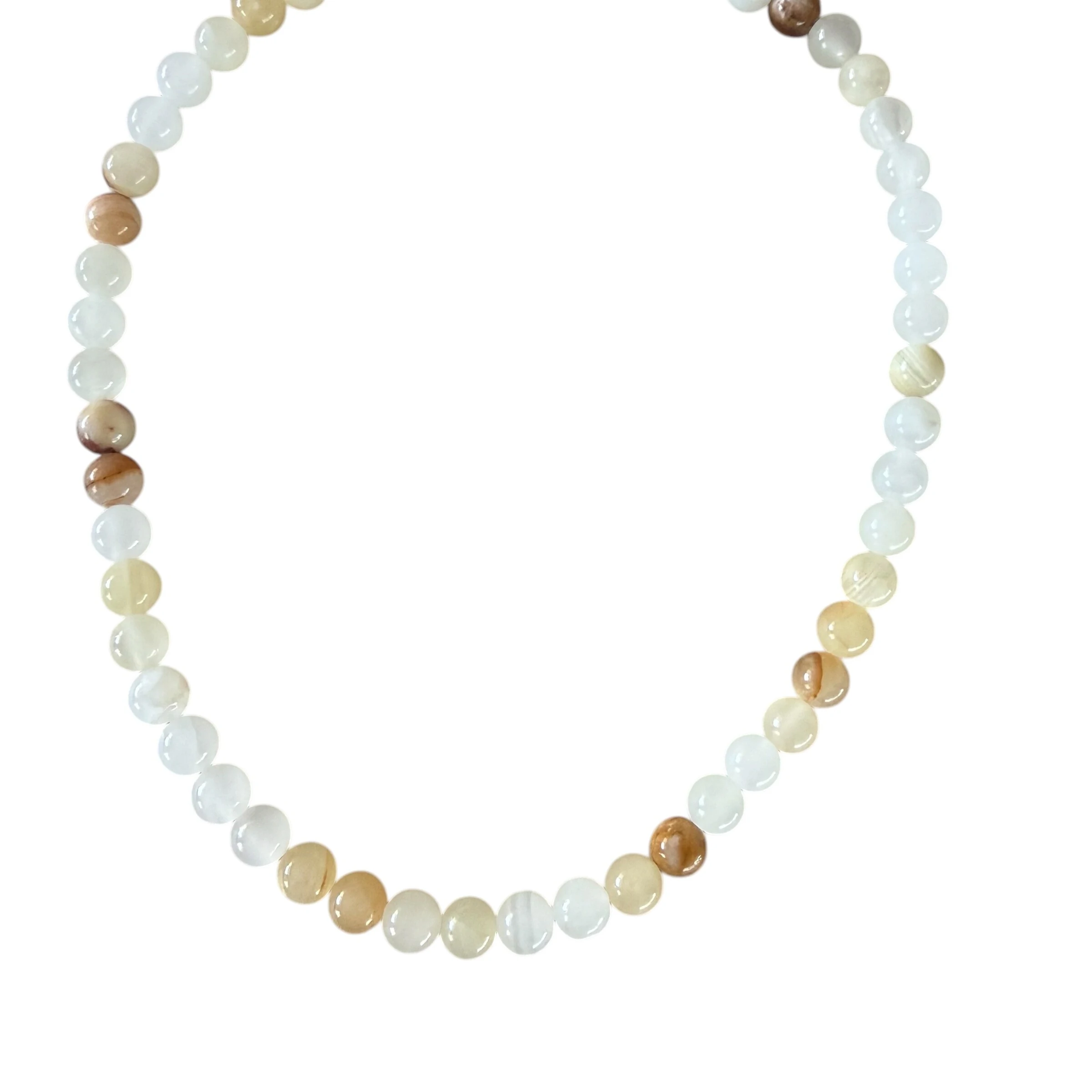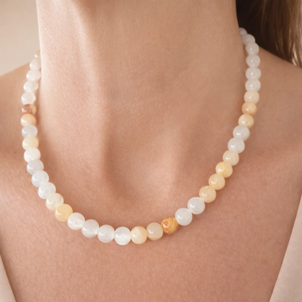 Com tonalidades suaves que variam entre o branco leitoso, bege e nuances levemente aquecidas, cada pedra apresenta características únicas, criando uma composição leve, harmoniosa e cheia de autenticidade.