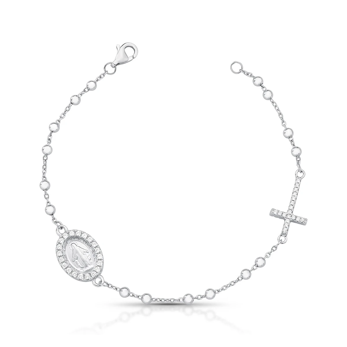 Pulseira Bolinhas com Nossa Senhora e Cruz Cravejada com Zircônias em Prata 925