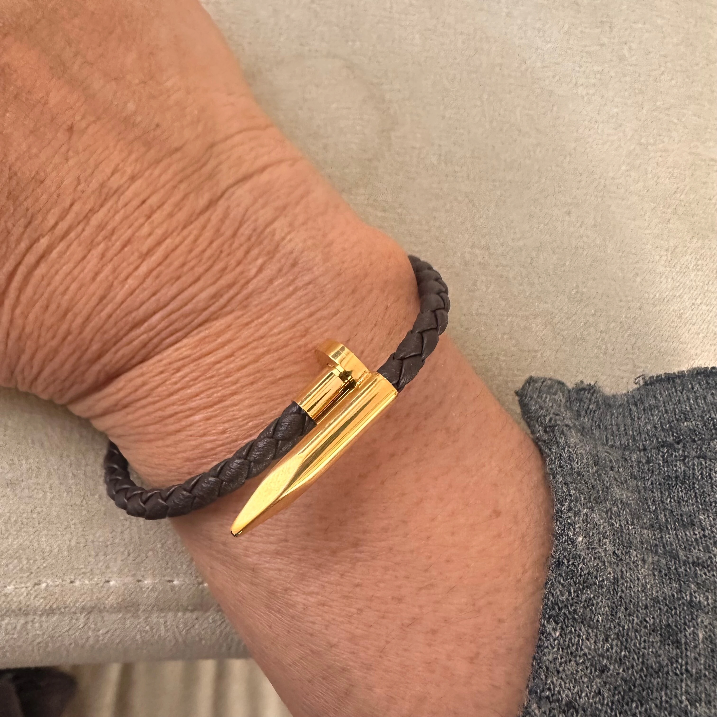 Pulseira Couro Marrom com Prego Dourado em Aço