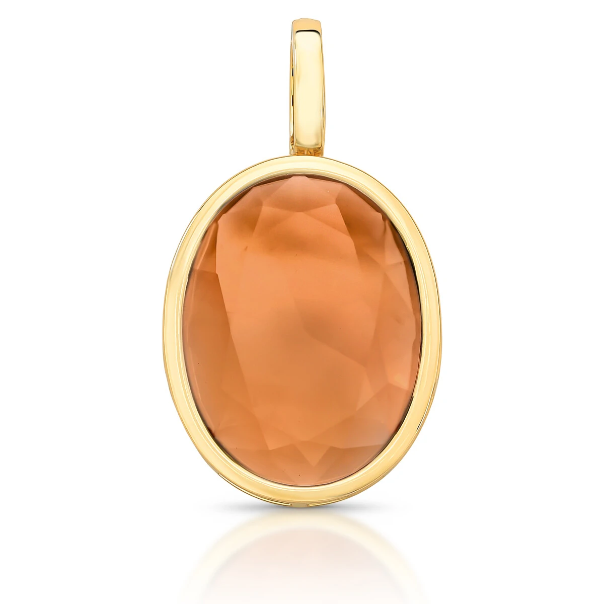 Pingente oval em semijoia com banho de ouro 18k e pedra de morganita em destaque, trazendo sofisticação e elegância para a composição.