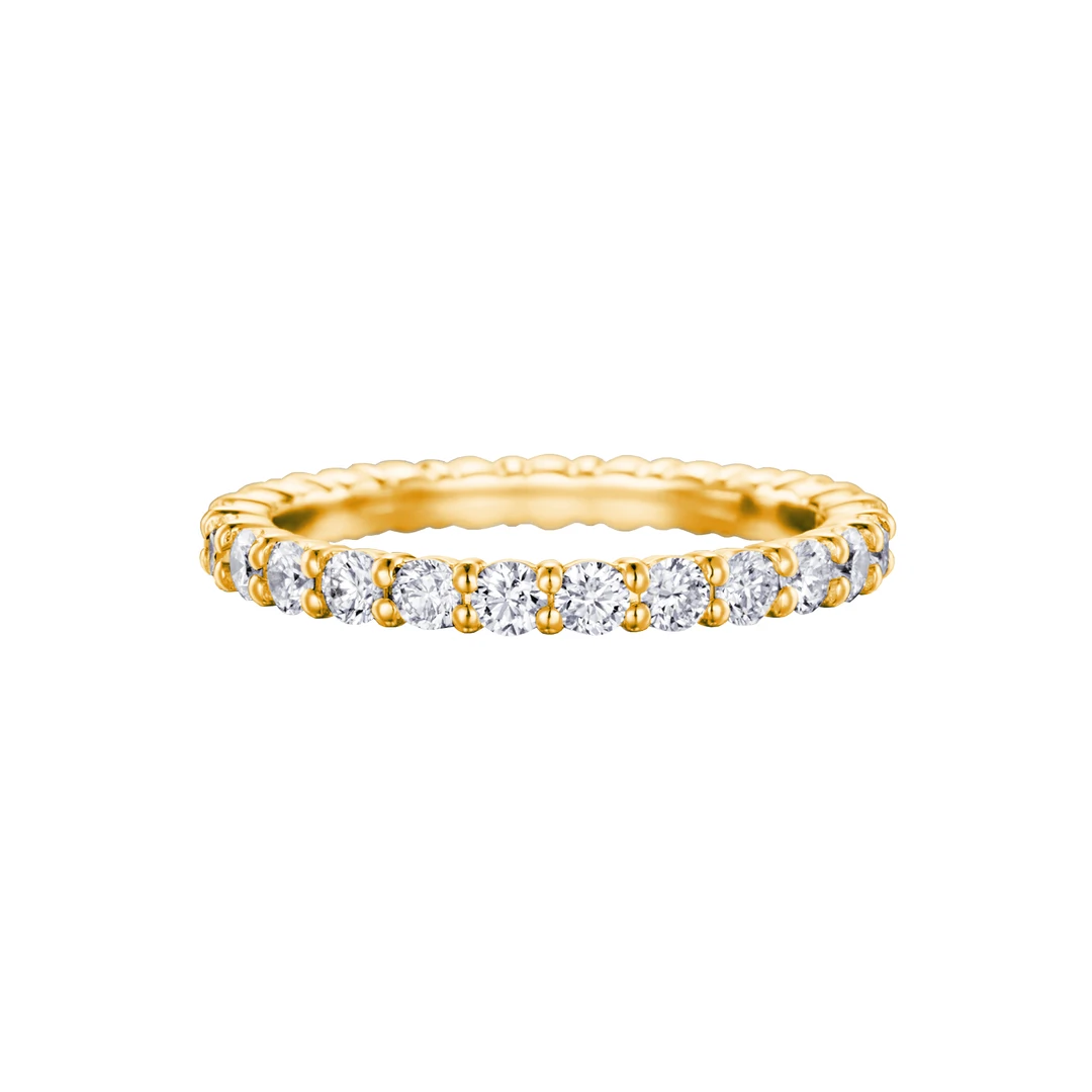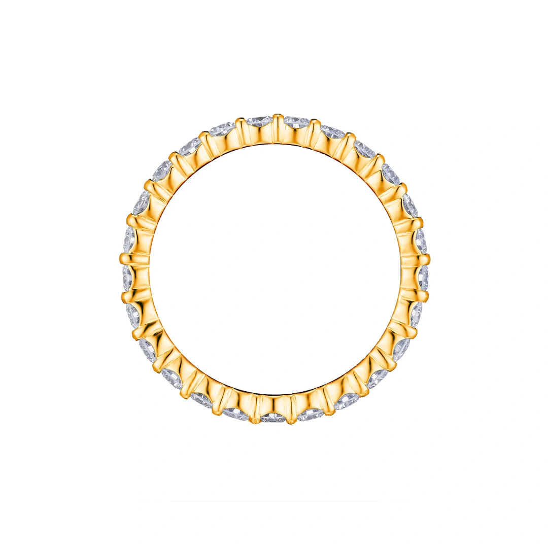 Aliança inteira cravejada em garra quadrada, com design delicado e acabamento sofisticado, perfeita para quem busca elegância e brilho contínuo.