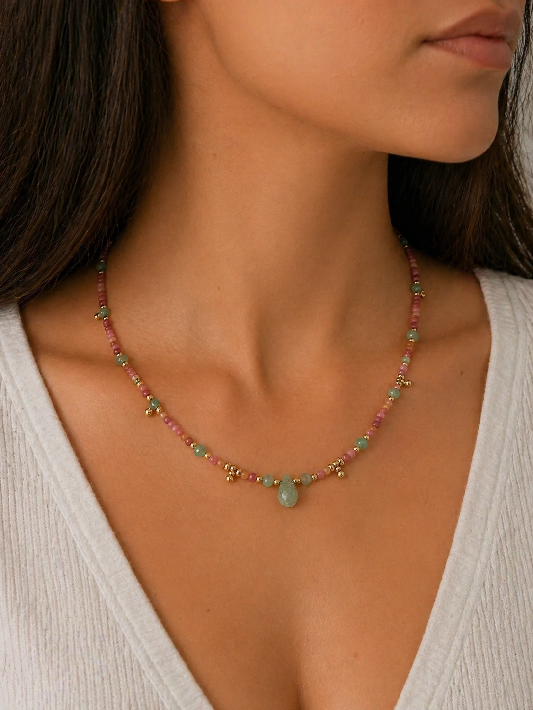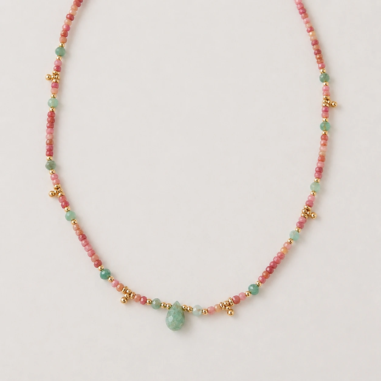 Colar de rodocrosita e amazonita com entremeios dourados, uma peça delicada e sofisticada que une a beleza das pedras naturais com um design elegante e atemporal.