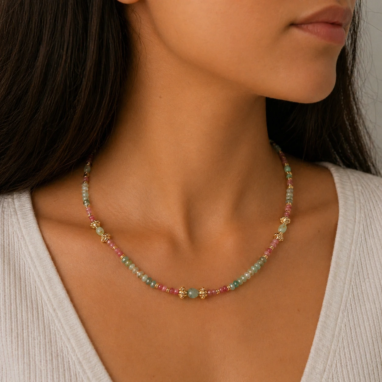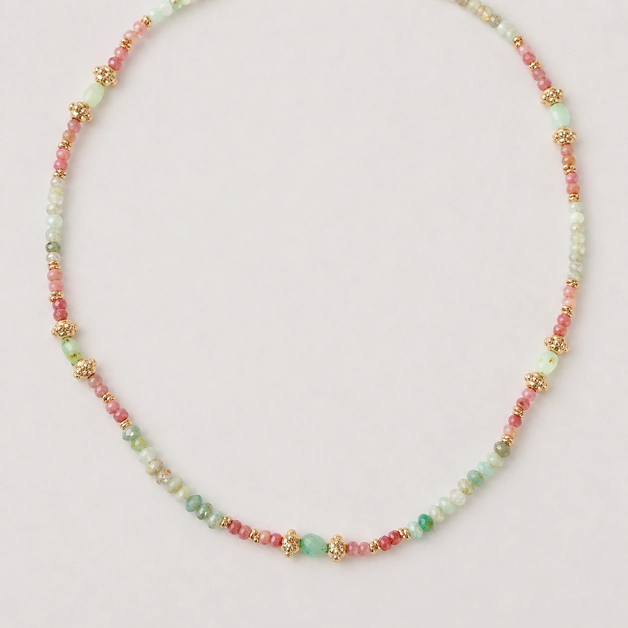 A combinação suave dos tons rosados da rodocrosita com o verde delicado da amazonita cria um visual leve, feminino e extremamente refinado. Os entremeios dourados acrescentam ainda mais charme e sofisticação, valorizando cada detalhe da composição e trazendo um acabamento luxuoso à peça.