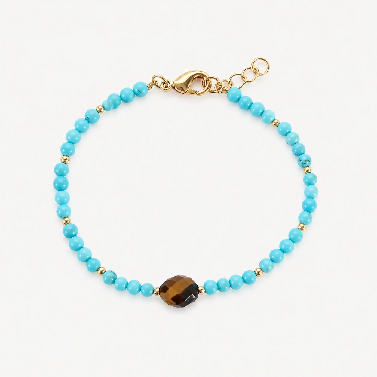 Seu design sofisticado combina a beleza vibrante das pedras de turquesa com o charme dos entremeios em bolinhas douradas, criando um visual leve, refinado e atemporal. O destaque central com olho grego traz ainda mais personalidade à peça, simbolizando proteção contra energias negativas e atraindo boas vibrações.